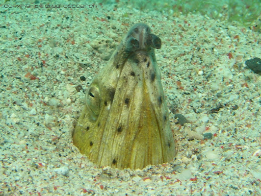 NOTE: Ci si presentano murene, scorfani, grandi pipistrello, altri nudibranchi e ricci coloratissimi. Una coppia di frog-fish sul relitto, gamberetti, granchio porcellana, sogliola, lionfish, pagliacci e un insolita "creatura" sepolta nella sabbia, con la sola testa fuori, scoprirò poi essere un'anguilla di mare.